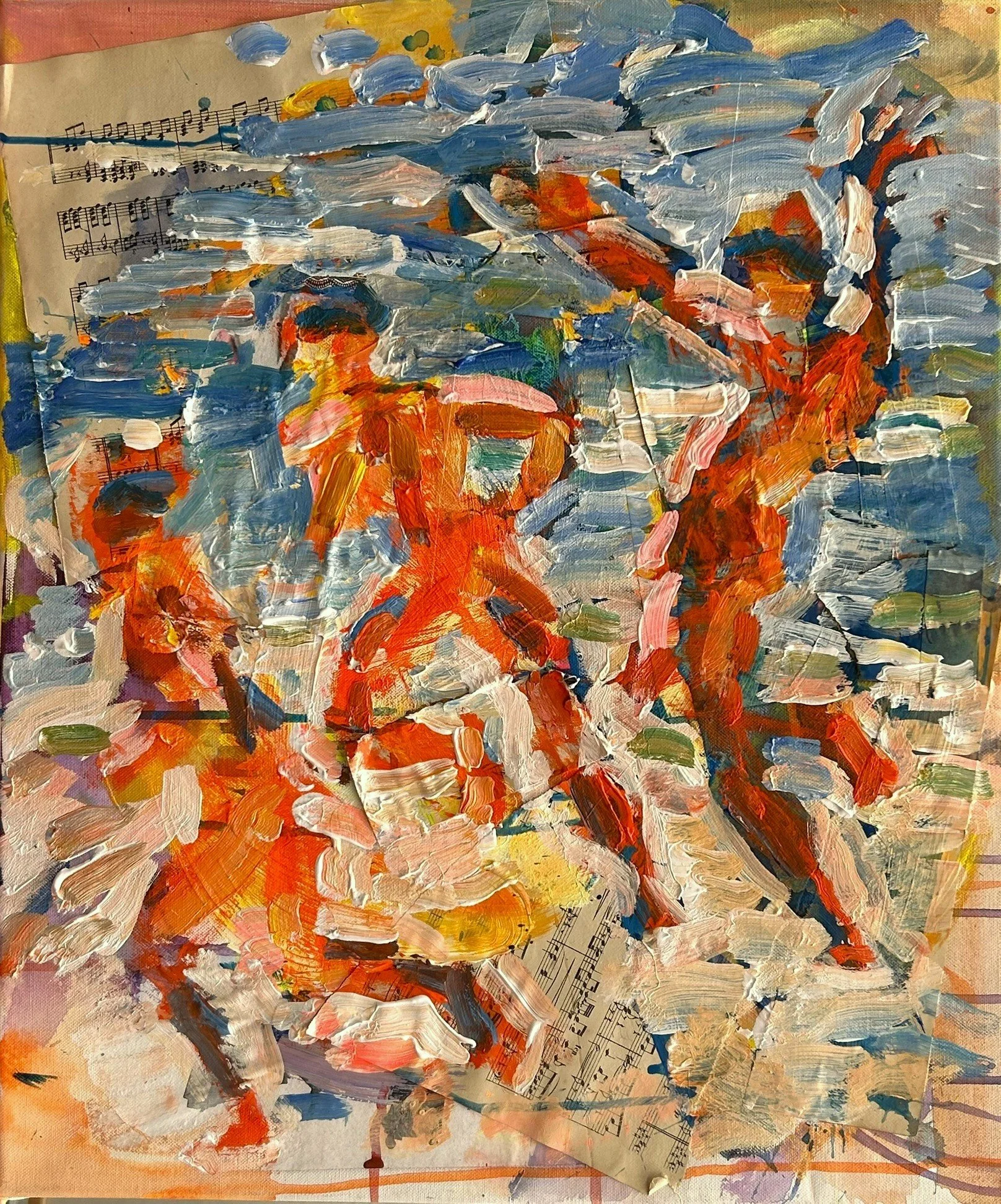 "Badende børn" (frit efter J.F. Villumsen) 2025 acryl og collage på lærred 55 x 46 cm