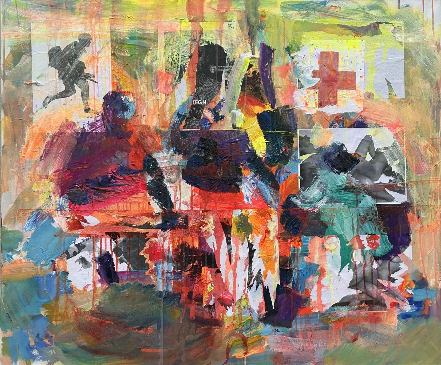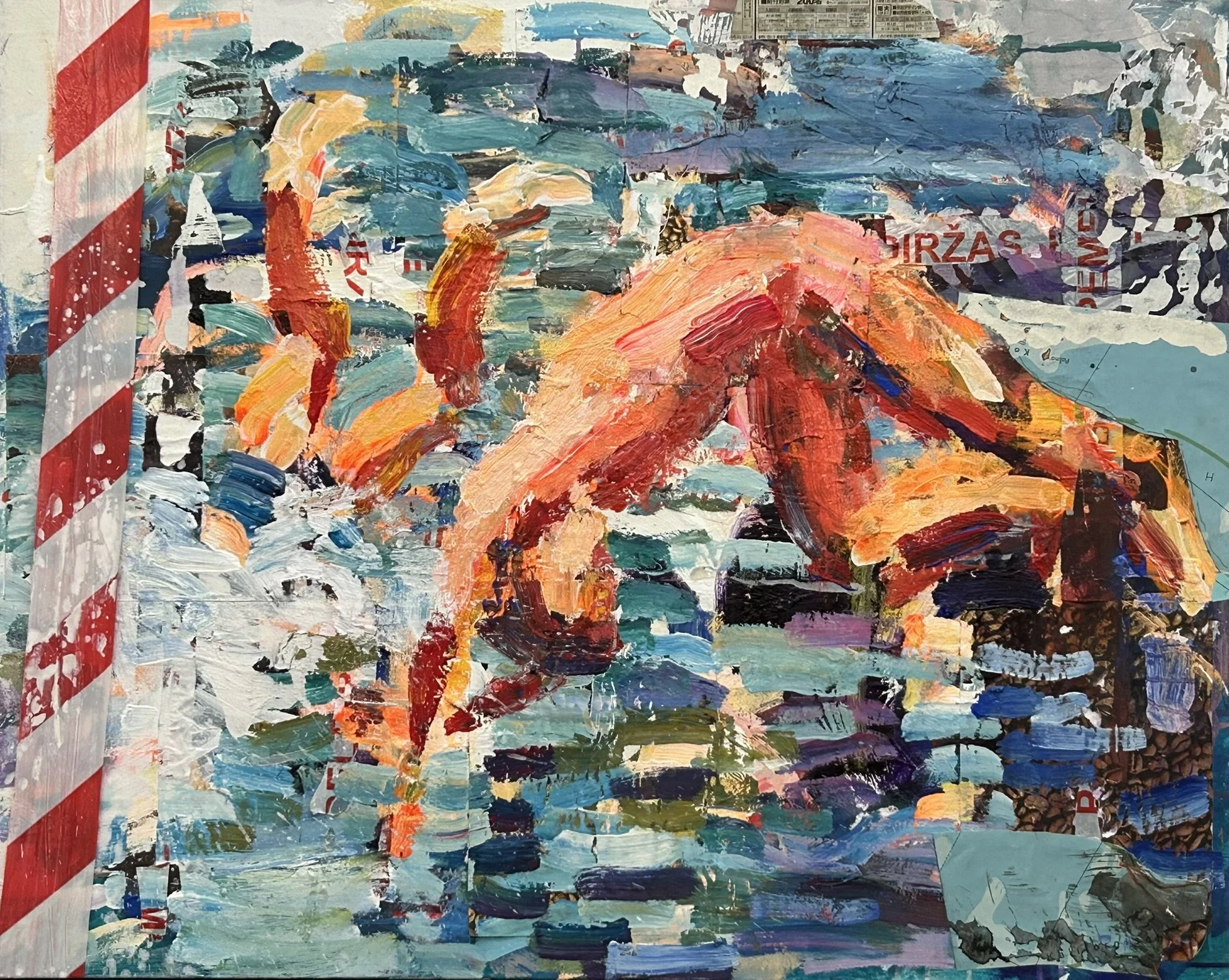 "Dreng springer i vandet" 2025 acryl og collage på lærred 114 x 100 cm