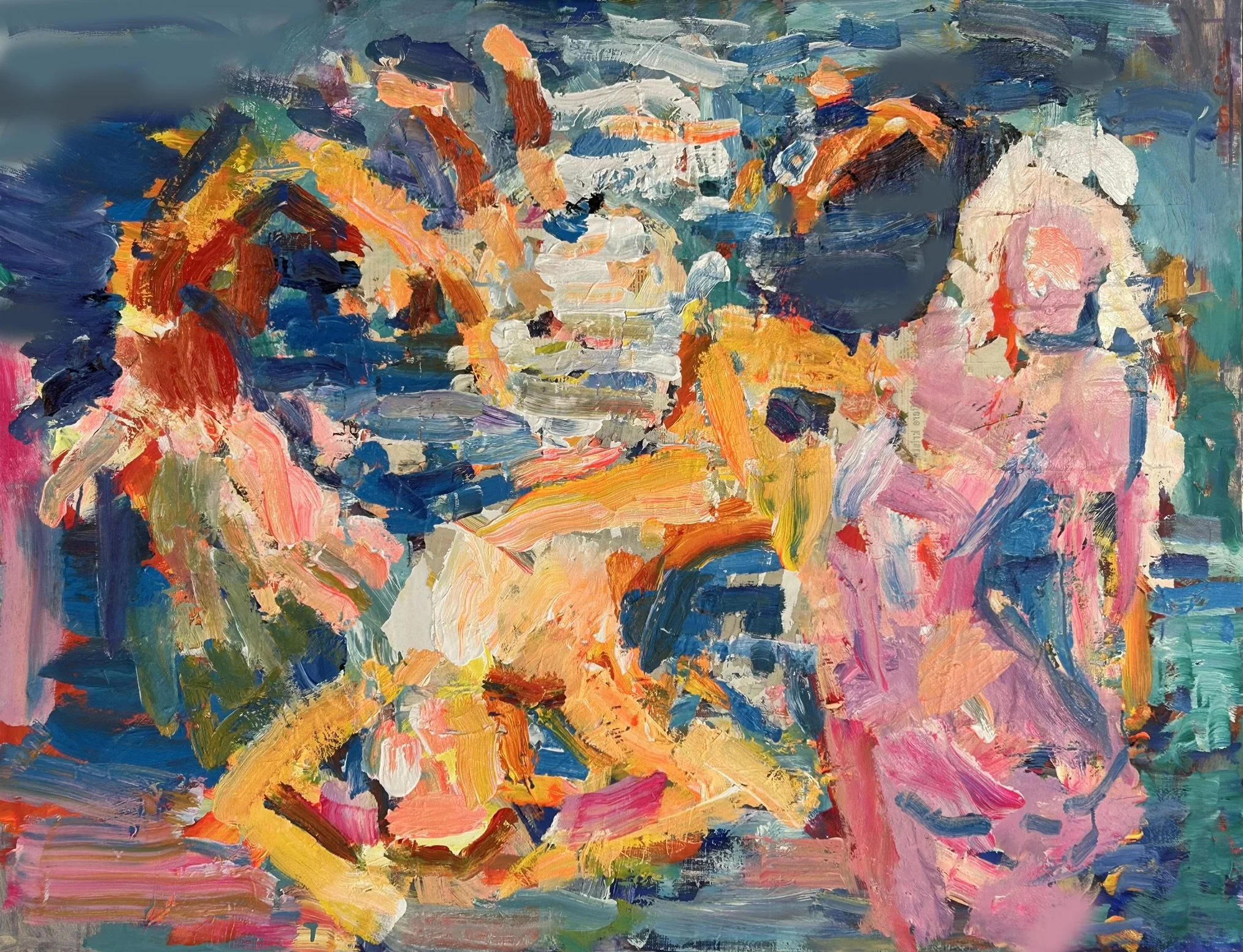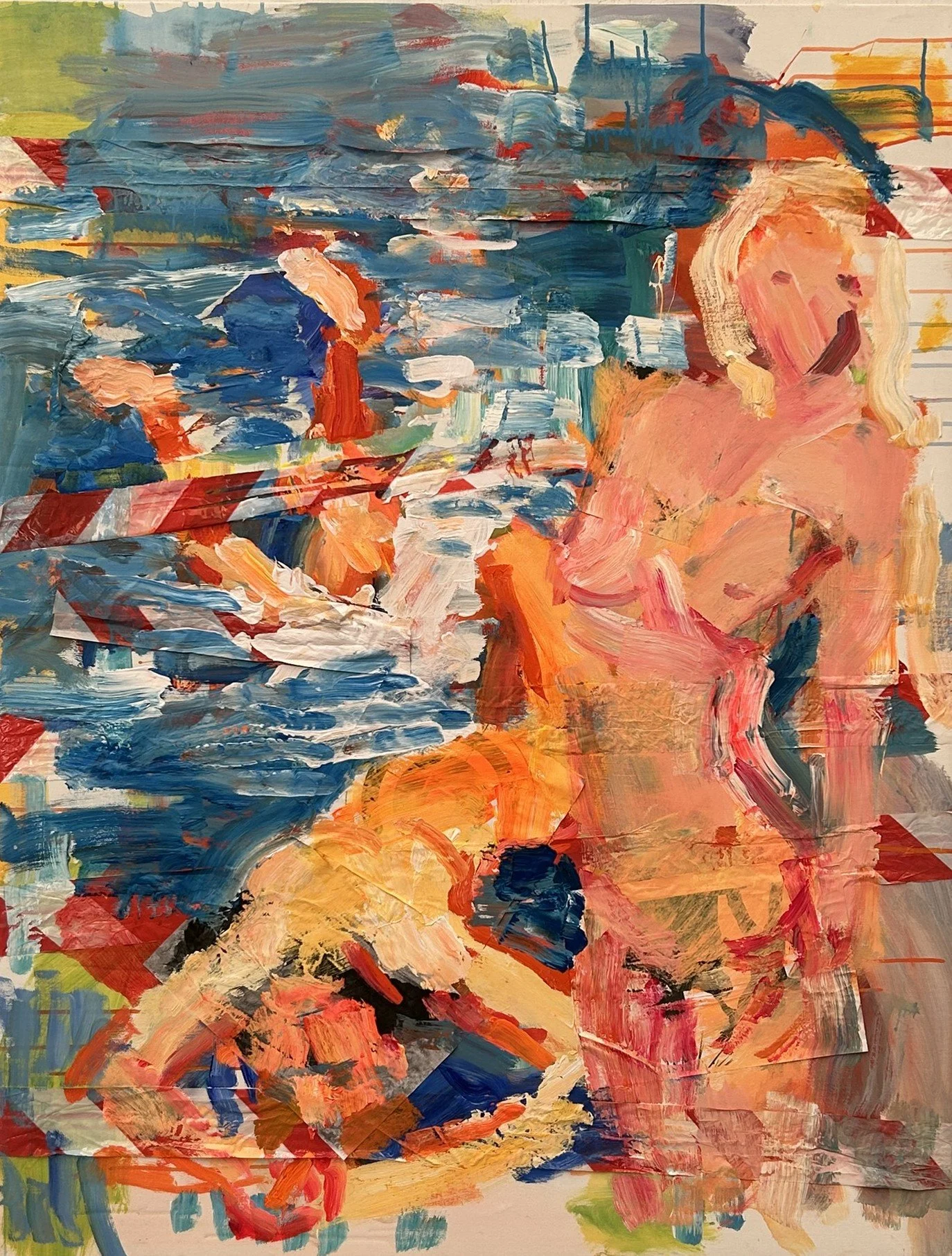 "Badende kvinder" 2025 acryl og collage på lærred 130 x 100 cm